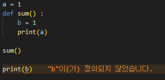 분명 b라는 변수가 있지만 정의되지 않았습니다. 라는 오류 문구가 나오면서 실행을 하게 되면 오류가 나게됩니다.