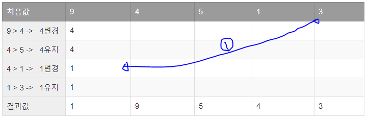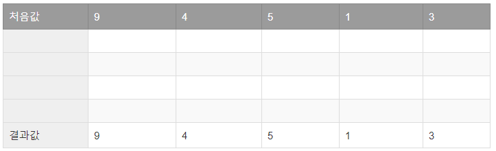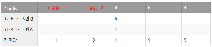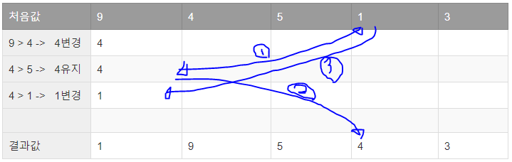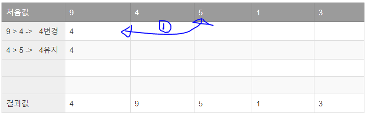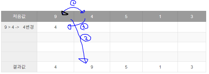 처음값 9와 나머지값 4 5 1 3 을 비교하여 더 작은 값일경우 서로 변경해주는 코드입니다.