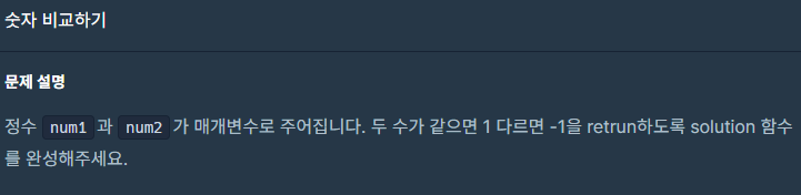 정수 num1 과 num2가 매개변수로 주어졋을때 두 수를 비교하여 두 수가 같으면 1 다르면 -1을 반환하는 문제입니다.