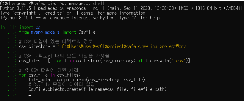 저는 장고쉘에서 이 코드를 작성하였습니다.