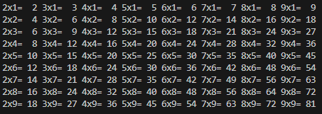 print("%dx%d= %2d" % (j, i, j * i), end="\t")